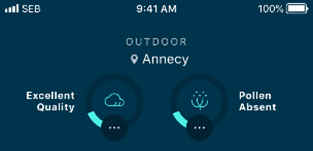 Aplikacija prikaže podatke o kakovosti zunanjega zraka in o cvetnem prahu na izbrani lokaciji: sprejmete lahko uporabo geografske lokacije ali pa ime kraja izberete v aplikaciji. - Indoor information (Podatki o notranjosti):