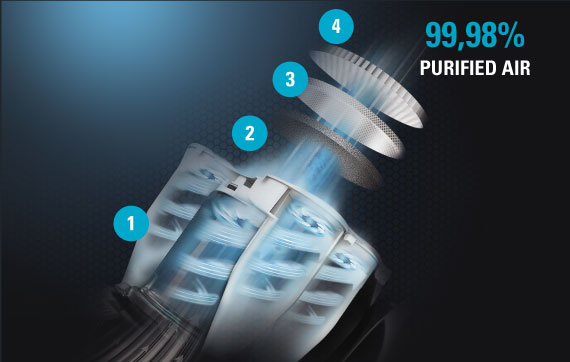Superior quality filters catch microscopic particles that cause allergies and asthma. Delivering air that is almost completely purified, with results as high as 99.98% and a class A energy efficiency label for air quality emitted, Rowenta is finding new ways to help you breathe easy at home.